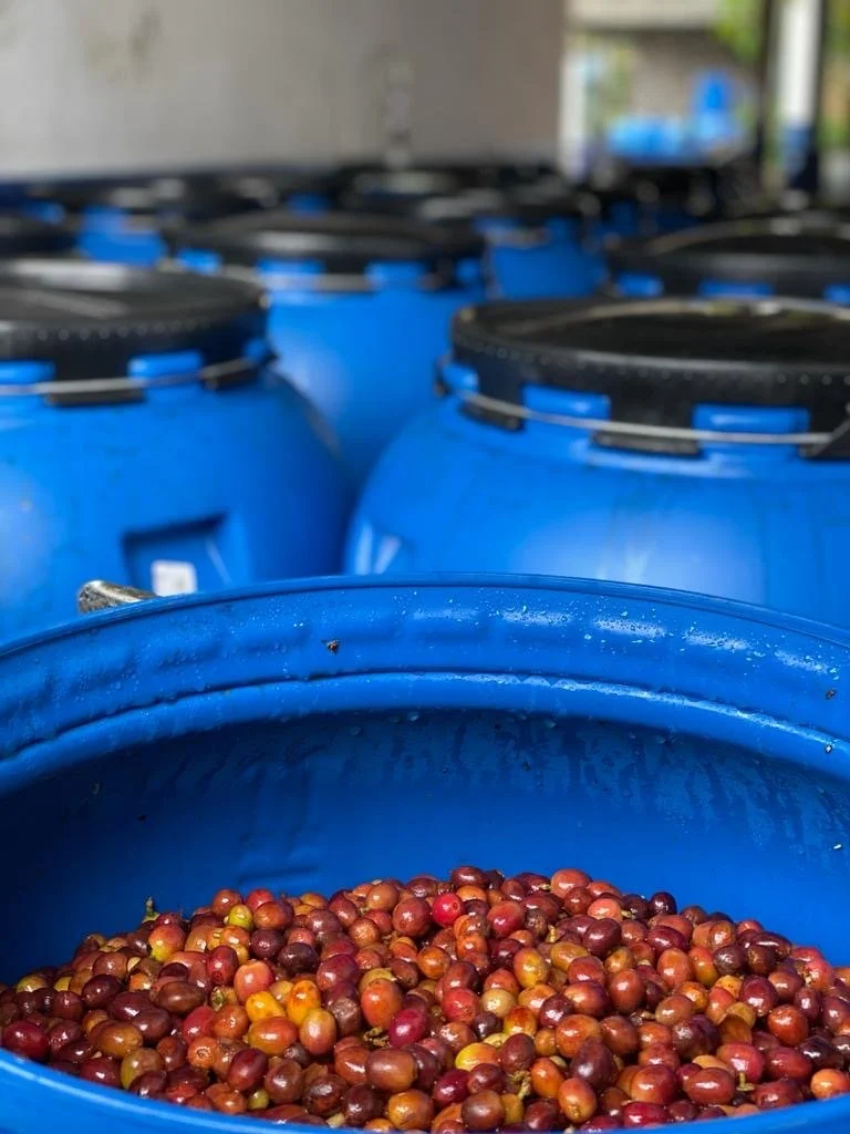 Collection and selection of cherries for this process comprises of a mix of (95% ripe and 5% semi-ripe cherries). The coffee undergoes 3 phases of fermentation. The first, the coffee is fermented whole cherry and is processed in 200 liter tanks utilizing anaerobic fermentation for 120 hours at 18 degrees Celsius with wine yeasts. The second phase, is then followed by depulping the coffee cherrys to a honey and a second phase anaerobic fermentation for 72 hours with CO2 injection along with dehydrated passion fruit and fruit glucose. The third phase, is a controlled canopy slow drying period for 5 days and final drying in sealed grainpro bags for an additional 15 days.